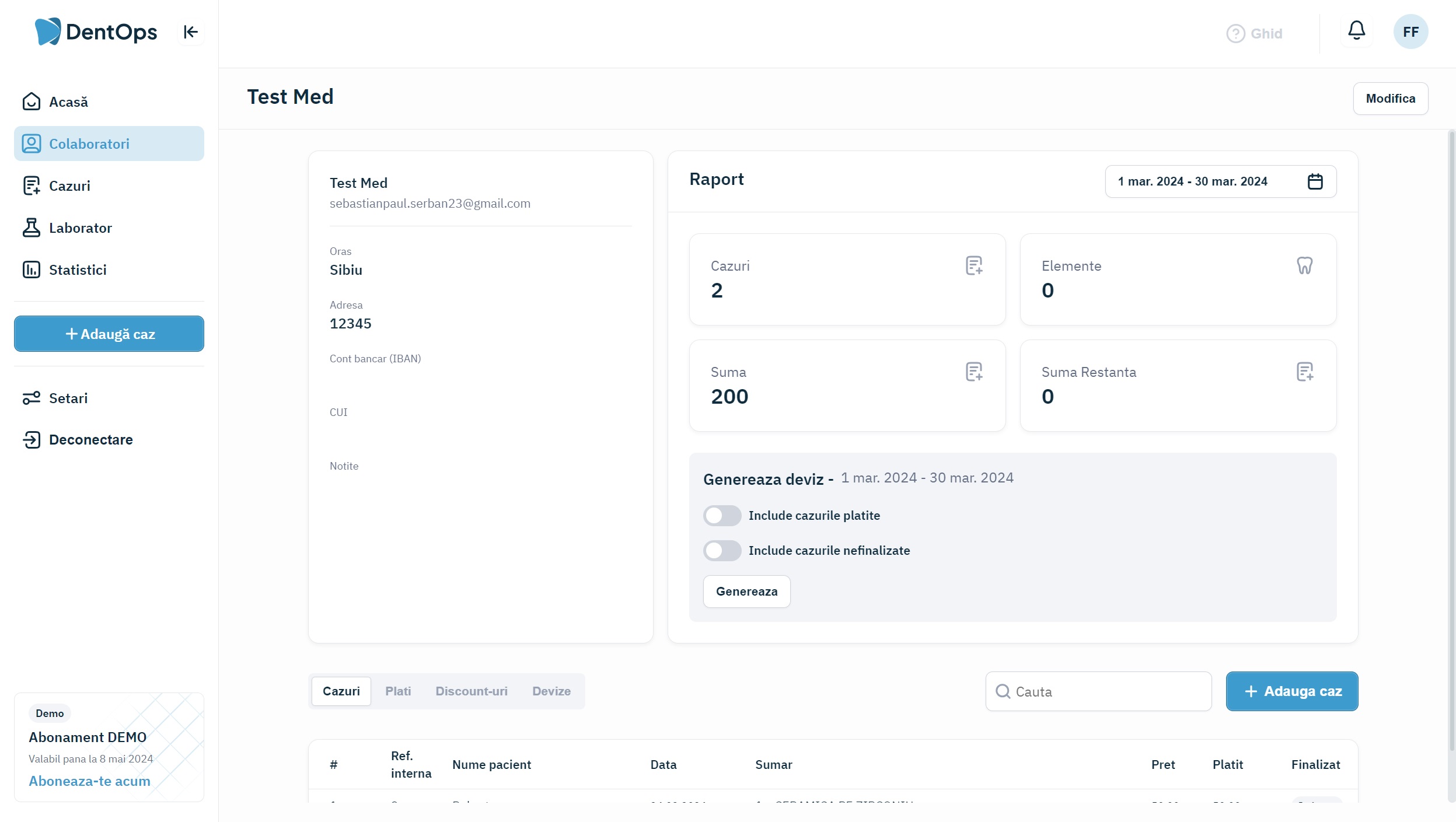 Aici aveti acces la toate informatiile depsre medici, respectiv cu privire la datele de contact, CUI, cont bancar, lista cu lucrari, plati, discount-uri acordate, etc. Din aceasta pagina putem sa generam si devize pentru acest medic pe orice perioada de timp.