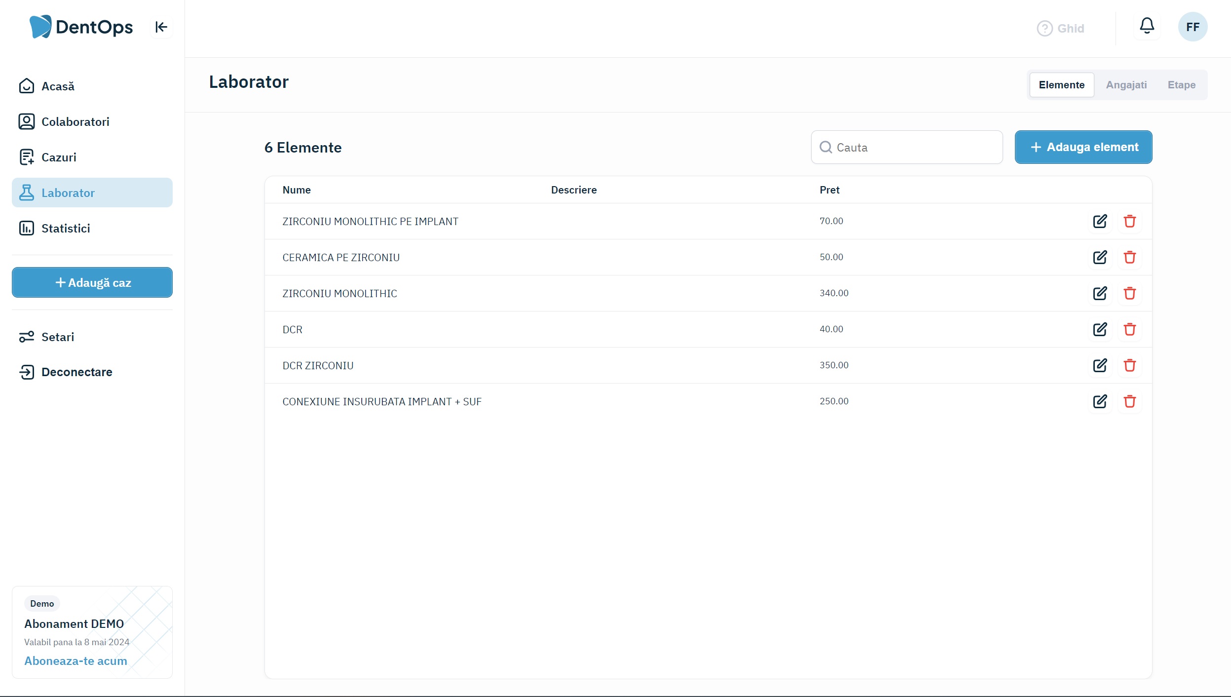 Pe aceasta pagina se poate introduce lista de preturi a tuturor lucrarilor executate de catre laborator.