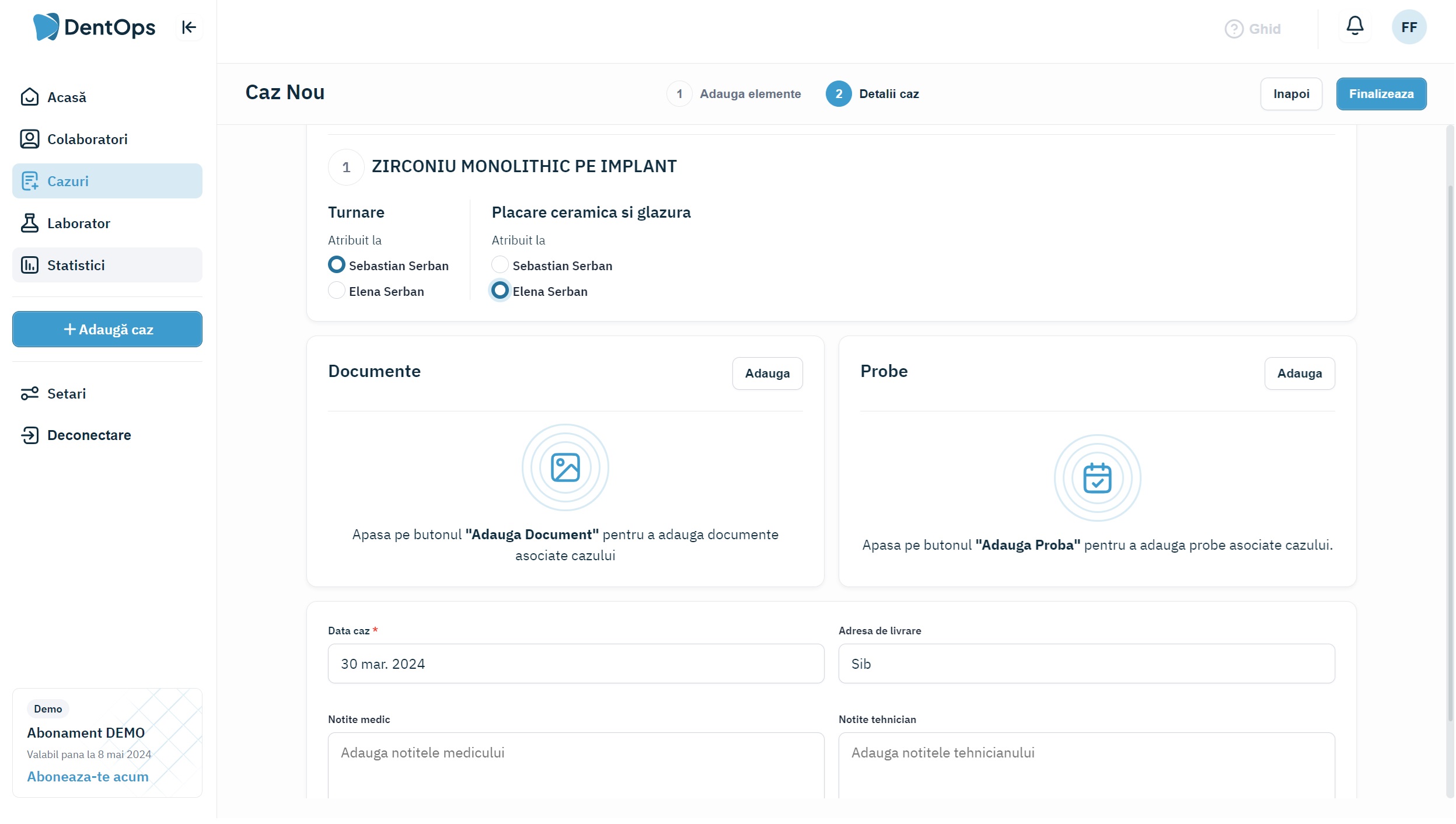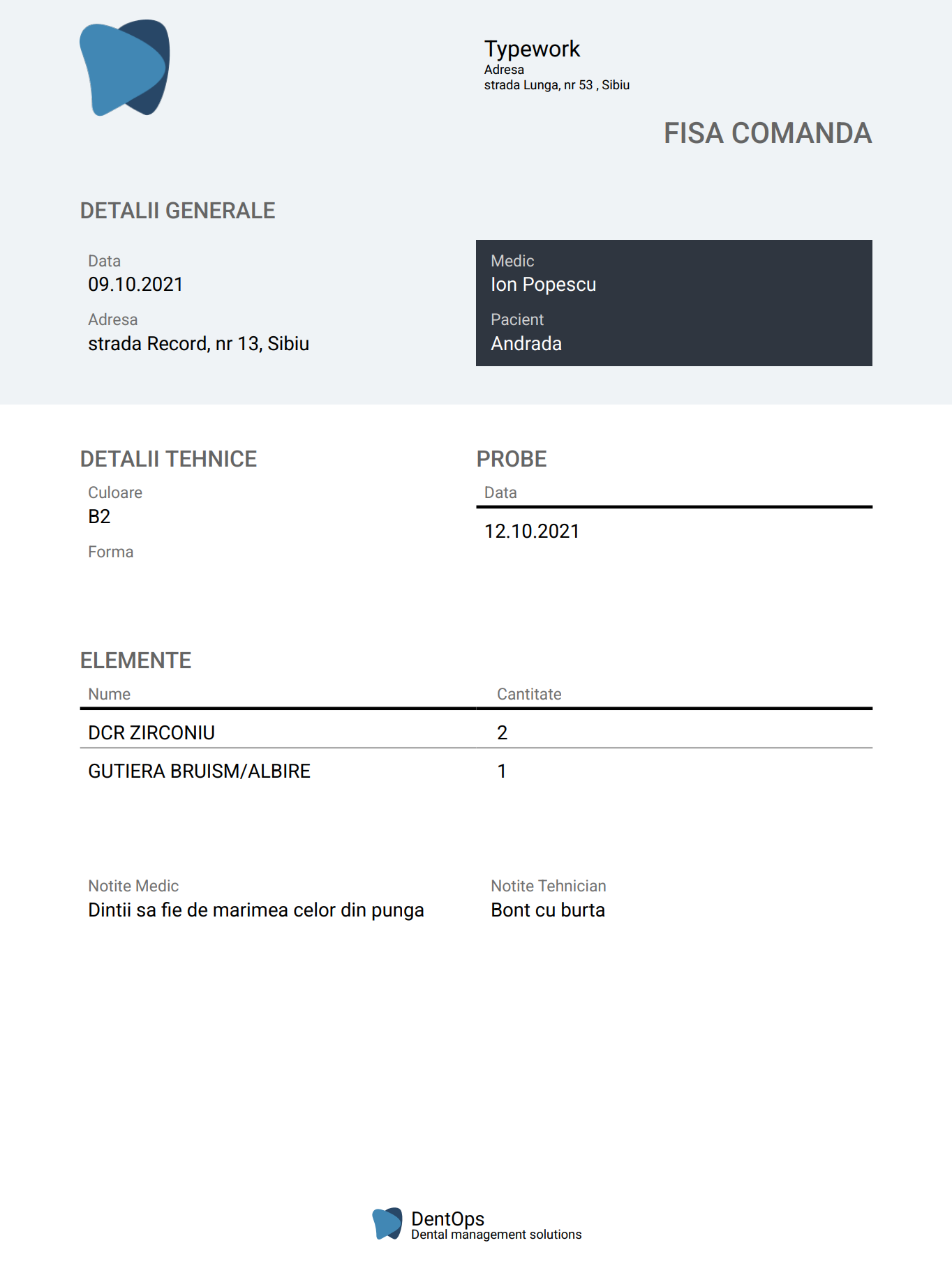 Expunerea tuturor detaliilor unei lucrari, de la elementele executate, la probe sau imagini incarcate, note adaugate de catre medic cat si de tehnician. Din aceasta sectiune se poate genera si o fisa a cazului automat.